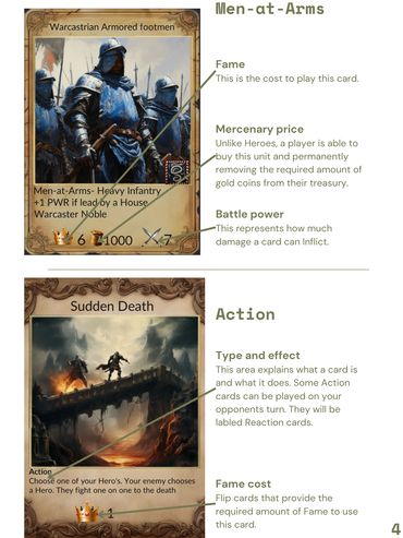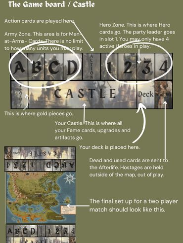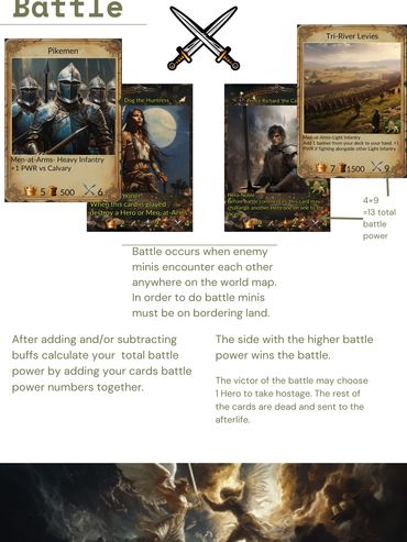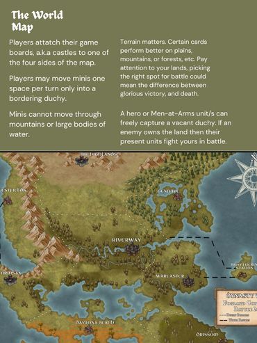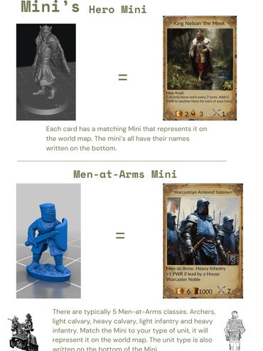 The base set release will include a House Nelson and House Warcaster starter decks with over 100 cards, 20 Hero Miniatures, 14 Men-at-Arms Miniatures, 14 Flags and 6 Castles/Towns. As well as 1 official rulebook, 2 Game mats and the Foglands battle map.