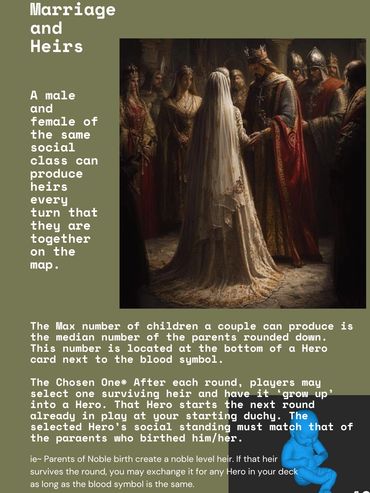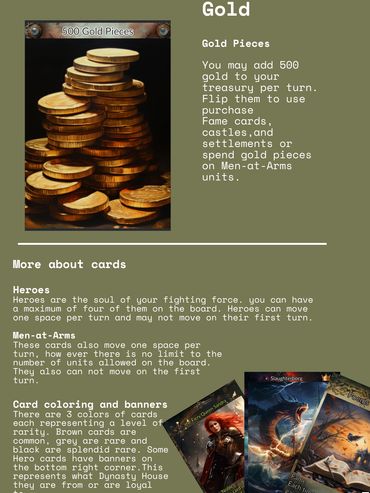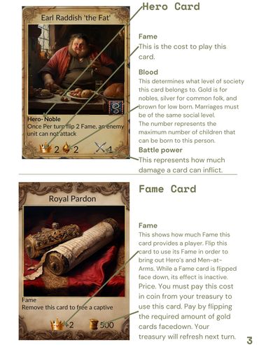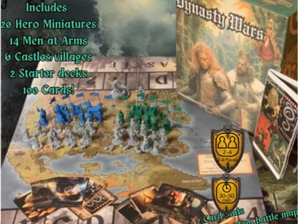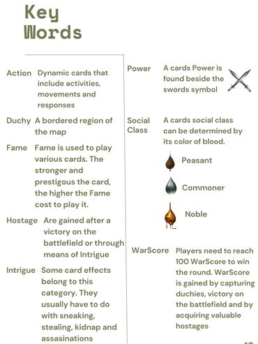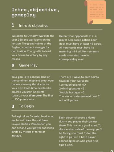The Dynasty Wars is a grand strategy deck building game. Players will plays as Dukes and compete head to head in either 1V1 or in a multiplayer setting with up to 4 opponents. The goal is to become king and have those who oppose you bend the knee. To win is simple. Get 100 War points. One must accumulate War score in one of three ways. Gaining land, winning battles or by taking noble hostages.